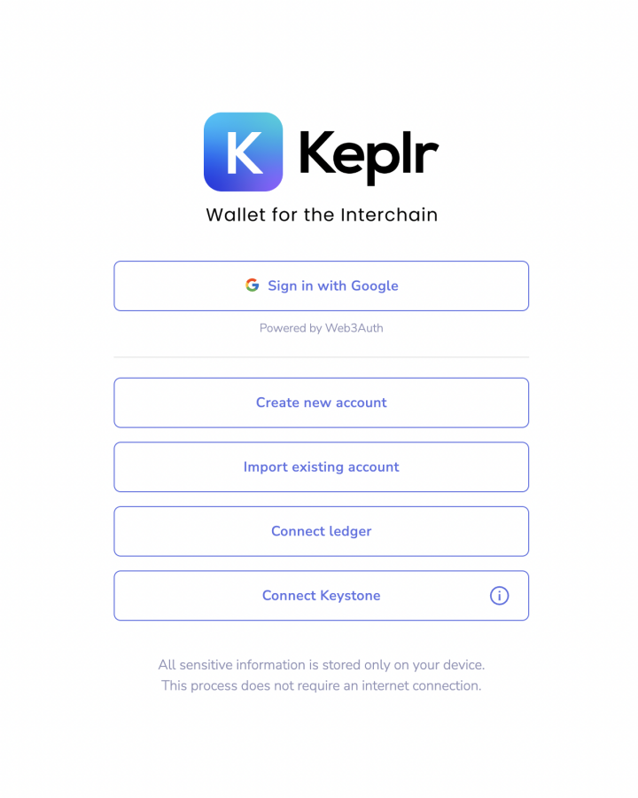 You'll now launch the Keplr wallet extension and will see the following 5 options