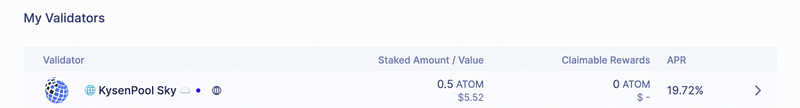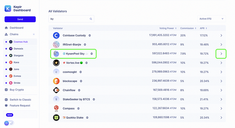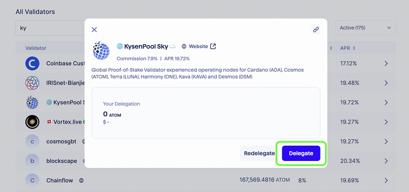 Select a validator of your choice to delegate your tokens to. We suggest you our validator — KysenPool Sky.