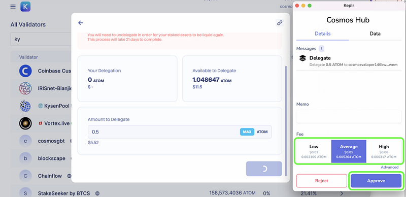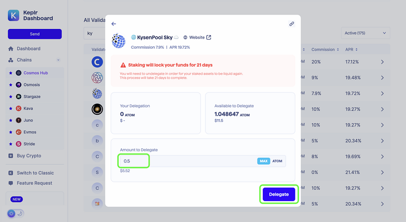Next step is to decide the number of ATOM tokens you want to delegate, press Delegate.