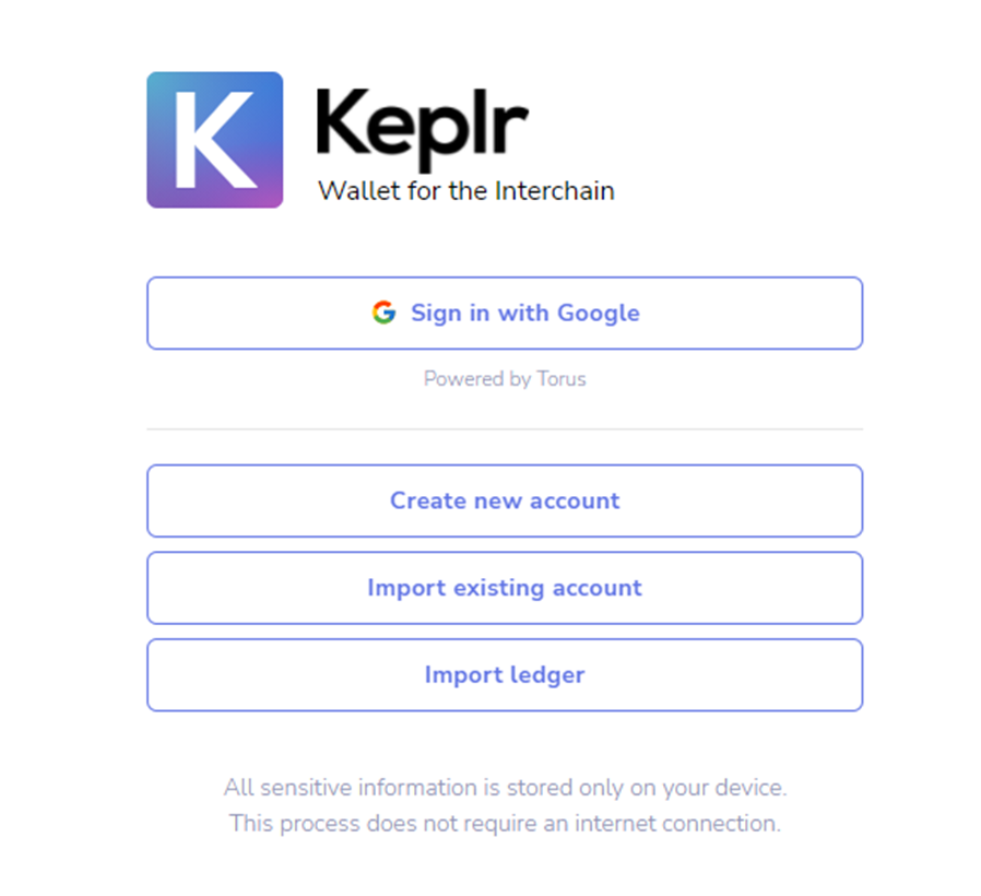 4. Now you have 4 options: import your account from a compatible* non-custodial wallet, import your Ledger account, create a new account via seed/mnemonic phrase or via One-Click Login. *compatible means a wallet that allows you to use the mnemonic/seed phrase to import your account to Keplr.
