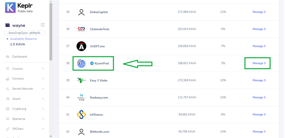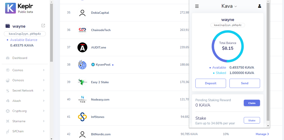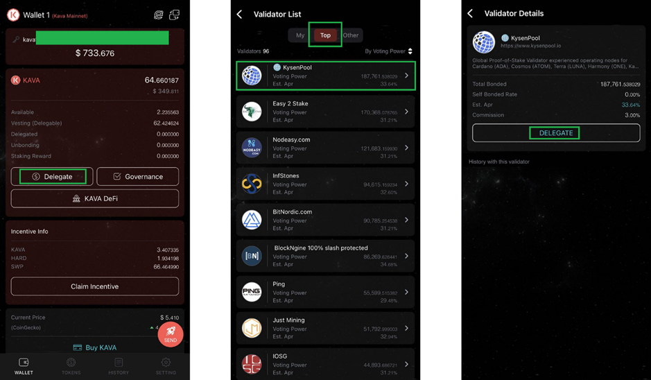 Now that you have KAVA in your account, you can make delegations to validators of your choice to start earning delegation rewards.