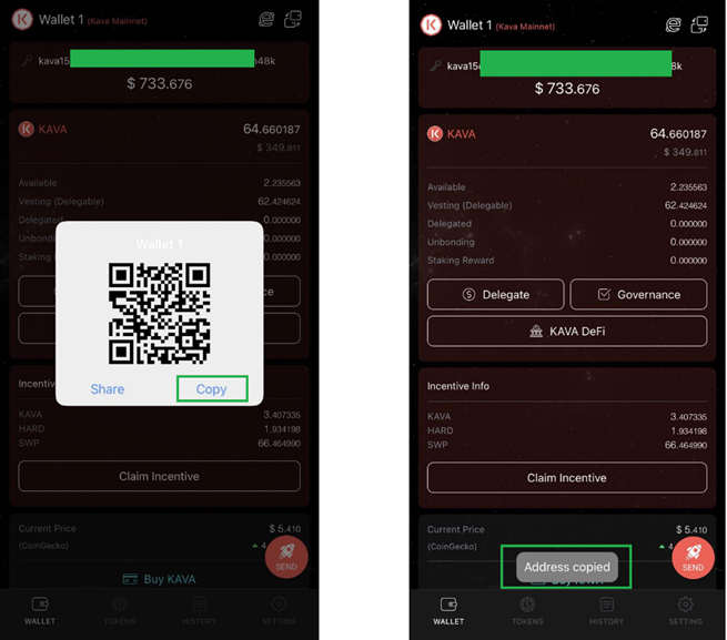 Press the QR code icon on the left of your address -> Press “Copy” to copy your personal KAVA address.