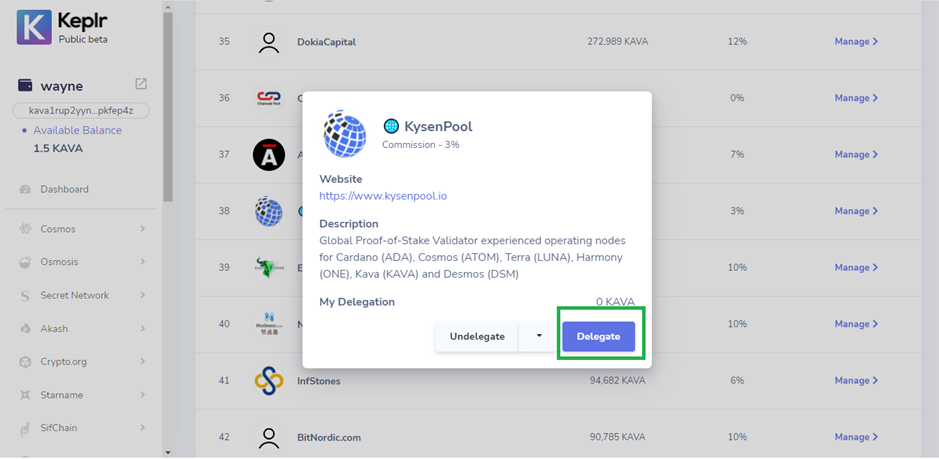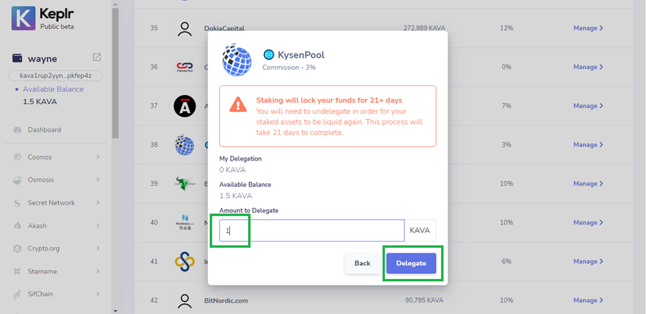 Next step is to decide the number of KAVA tokens you want to delegate, press Delegate.