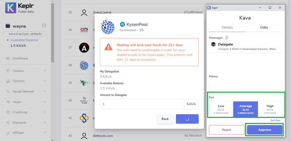 Please note that you will not be able to make additional transactions (claim rewards, send, etc.) if you delegate your entire available amount. Make sure to leave a minimal amount of KAVA for transaction fees for future transactions.