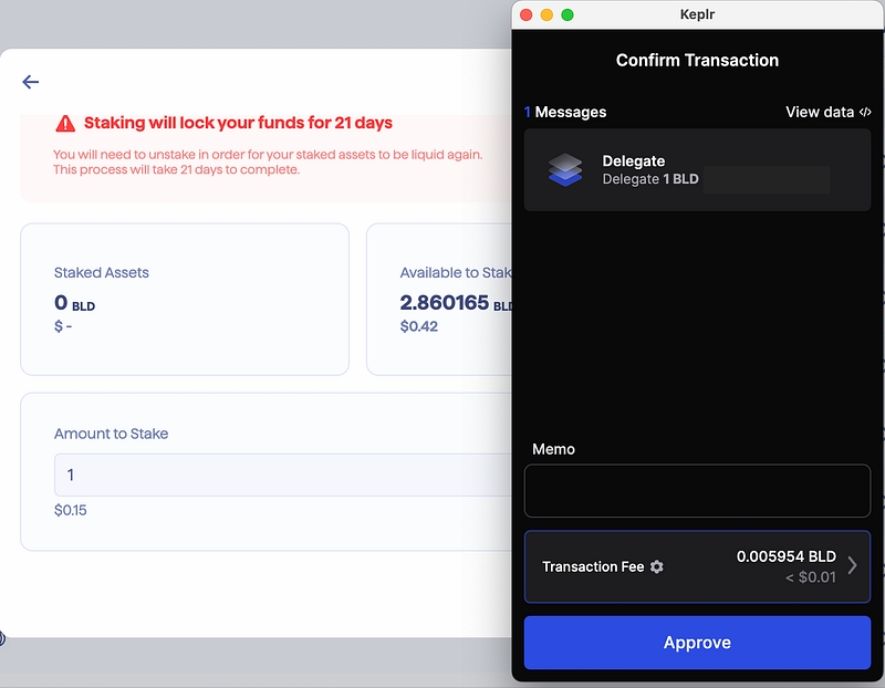 You have now staked your BLD tokens and will begin earning staking rewards!