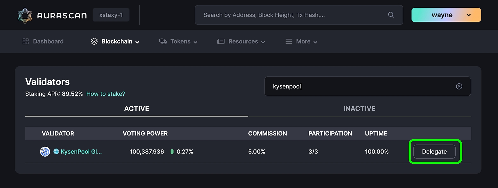 Select a validator of your choice to delegate your tokens to. We suggest you our validator — 🌐 KysenPool Glowing 🌟.