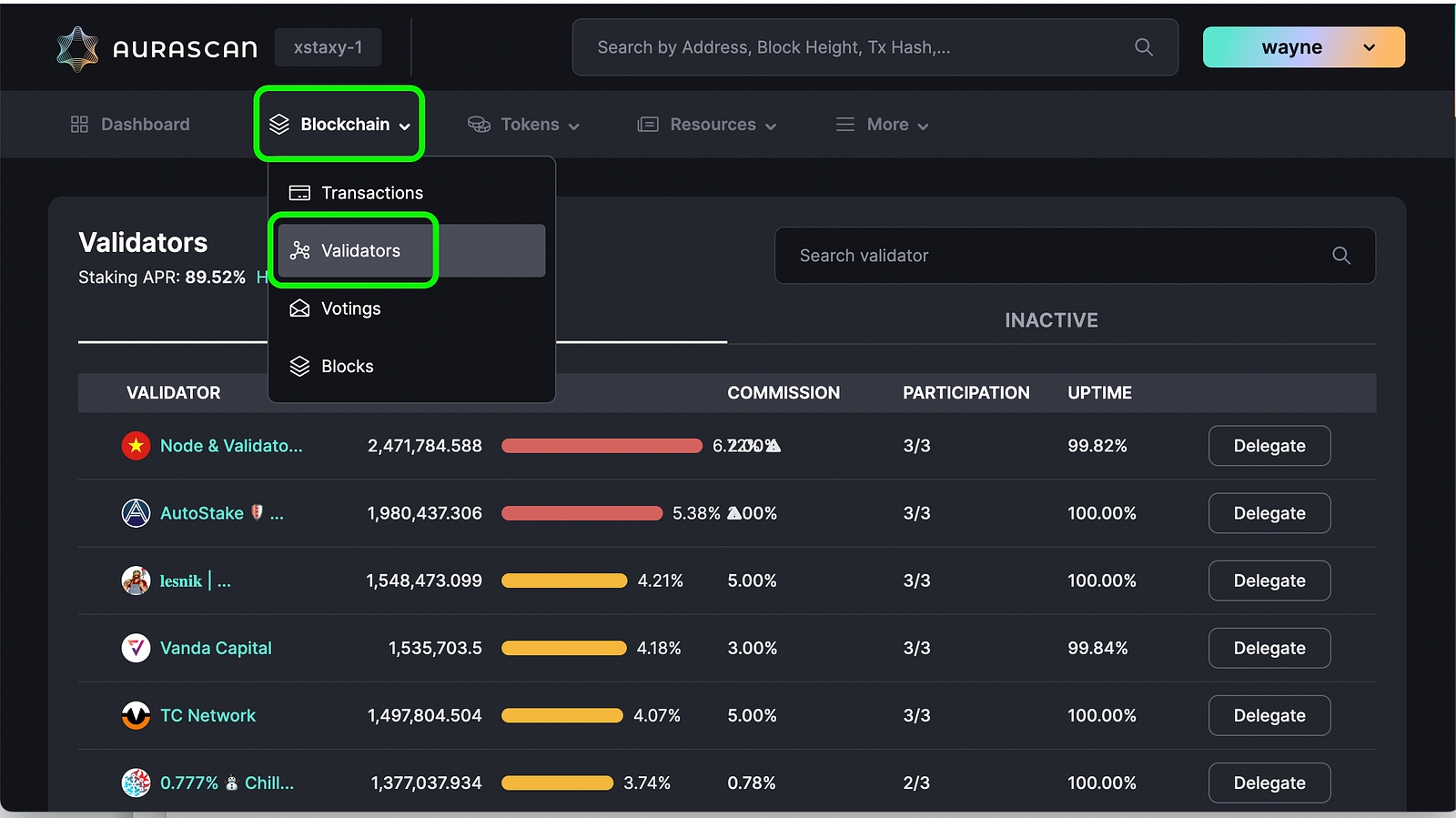 AURA holders can earn staking rewards, thereby increasing their AURA holdings by simply staking their AURA tokens with any one of the active validators on the network.